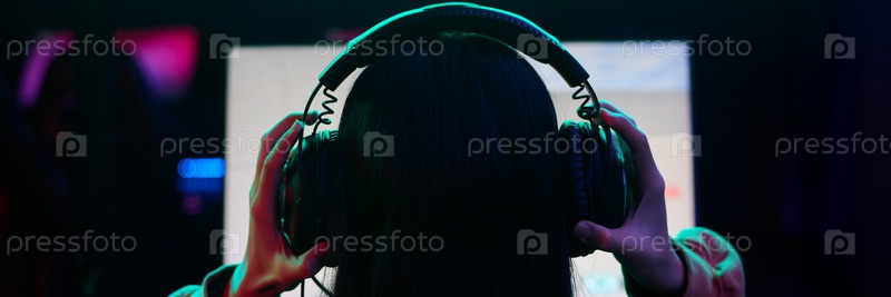 Подростковая девушка-геймер, носящая наушники, участвует в турнире по киберспорту