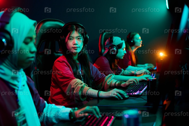 Мультиэтническая команда девочек-подростков играет в видеоигру электронных видов спорта на игровой арене