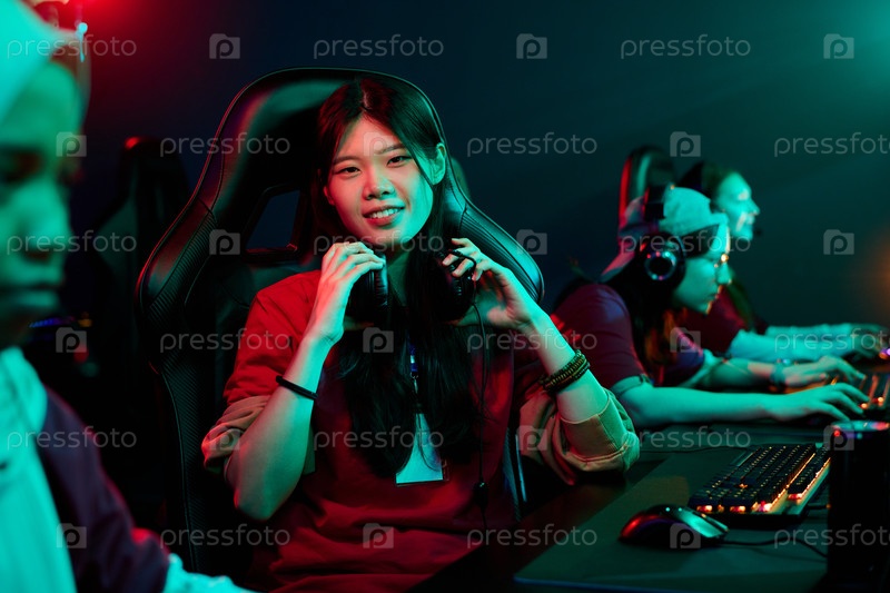 Портрет азиатской молодой взрослой женщины, ведущей различные девушки игроки команды соревнуются