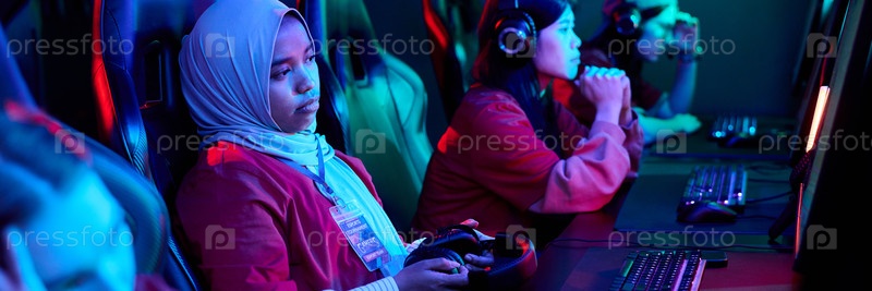 Мультиэтническая команда девочек-подростков играет в видеоигры на спортивной арене