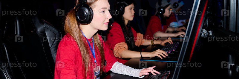 Команда многонациональных девочек-подростков, участвующих в турнире по киберспорту с использованием компьютеров
