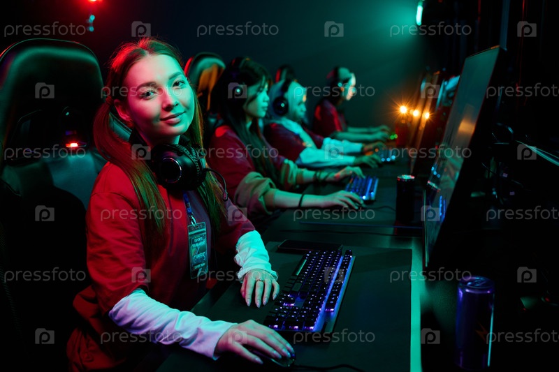 Портрет подростковой девушки-геймера, улыбающейся во время соревнований в команде E-sports Team