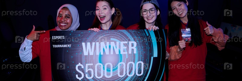 Группа разнообразных подростковых девушек-игроков празднует победу на турнире по киберспорту