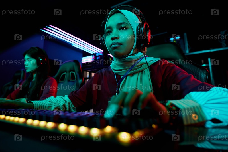 Мусульманская подростковая девушка-геймер сосредотачивается, конкурируя в командном матче по киберспорту