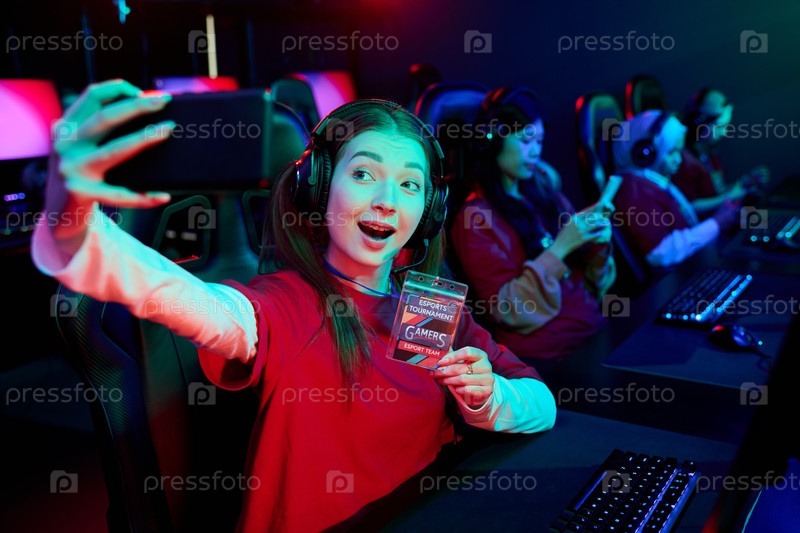 Подростковые многонациональные девушки игроки команды принимают селфи во время турнира по киберспорту