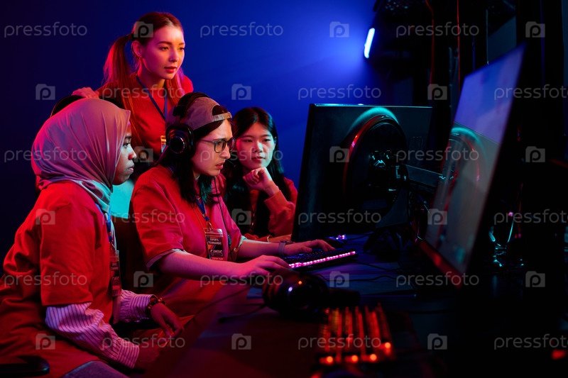 Разнообразная команда подростковых девочек Esports сотрудничает во время онлайн-игрового турнира
