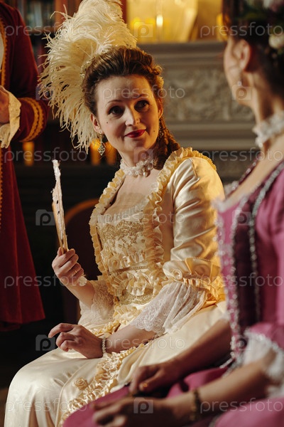 Портрет молодой взрослой женщины, одетой в костюм барокко и улыбающейся внутри