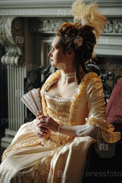 Женщина средних лет в барокковом платье сидит и держит веер