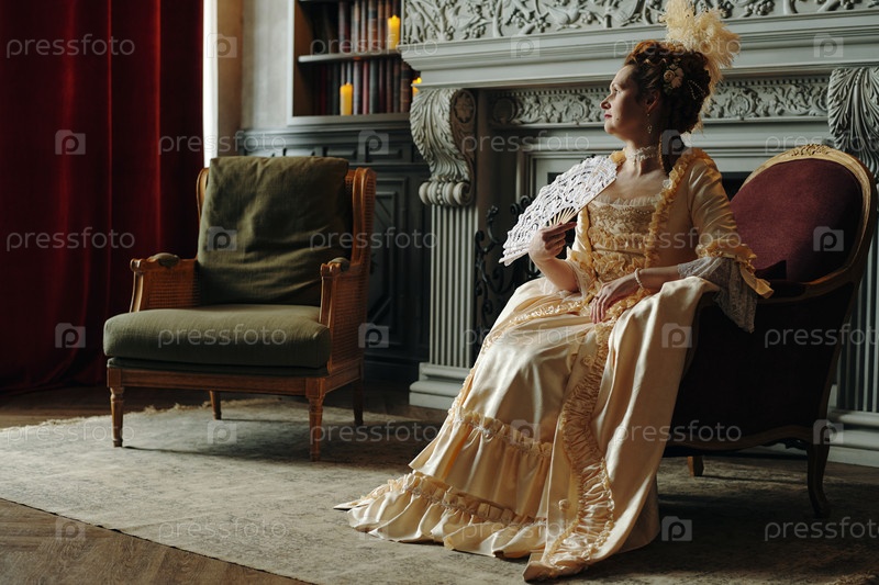 Молодая взрослая женщина сидит в барокковом интерьере, держа декоративный веер