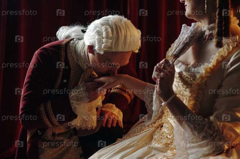 Молодой взрослый мужчина выражает восхищение поцелуем женщину рукой барокко
