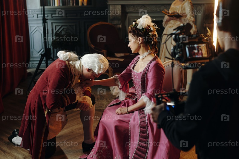 Молодой взрослый мужчина на коленях и целует руку женщины