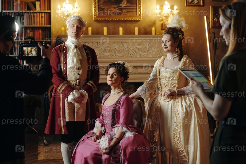 Мужчина и женщина средних лет воссоздают сцену эпохи барокко в помещении