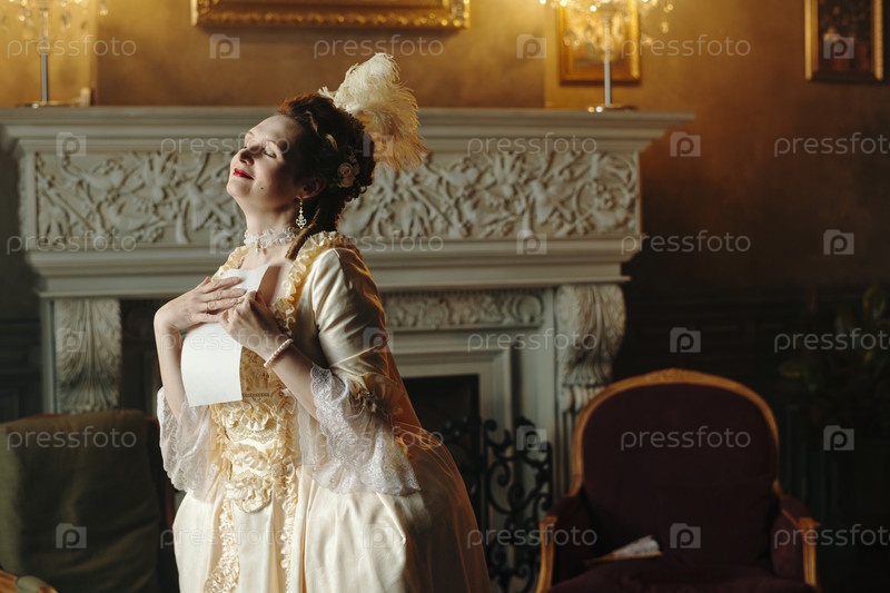 Молодая взрослая женщина обнимает письмо в интерьере барокко-ренесанса