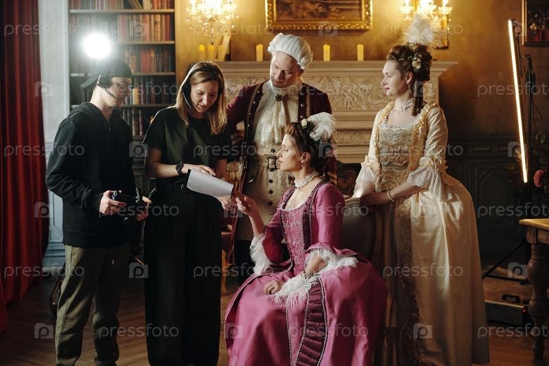 Мультиэтническая съемочная группа снимает взрослых в костюмах барокко внутри дома