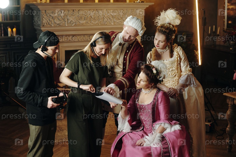 Молодые взрослые и мужчина среднего возраста репетируют сцену барочного театра