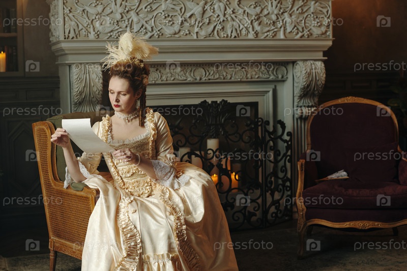 Молодая взрослая женщина с экзаменационным письмом сидит в барокко-ренесансной комнате