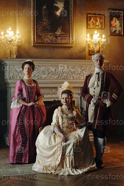 Молодые взрослые в костюмах барокко позируют в интерьере эпохи Возрождения