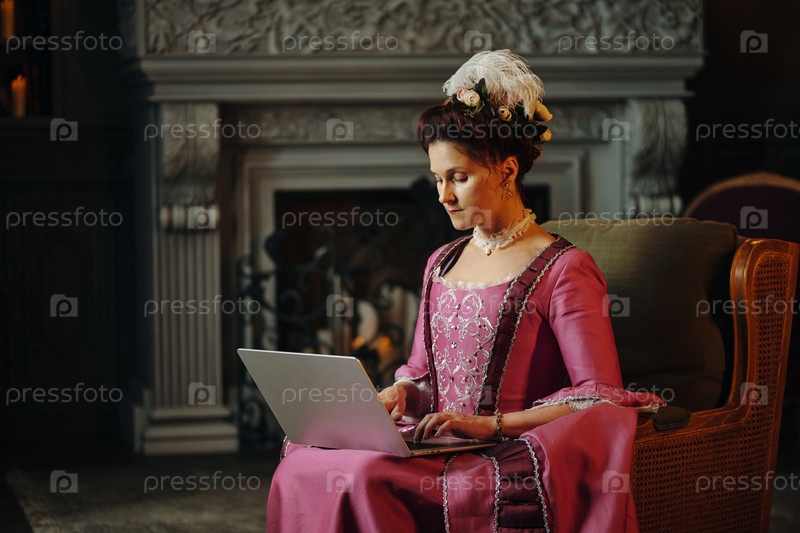 Женщина среднего возраста в барокковом платье с использованием ноутбука внутри дома