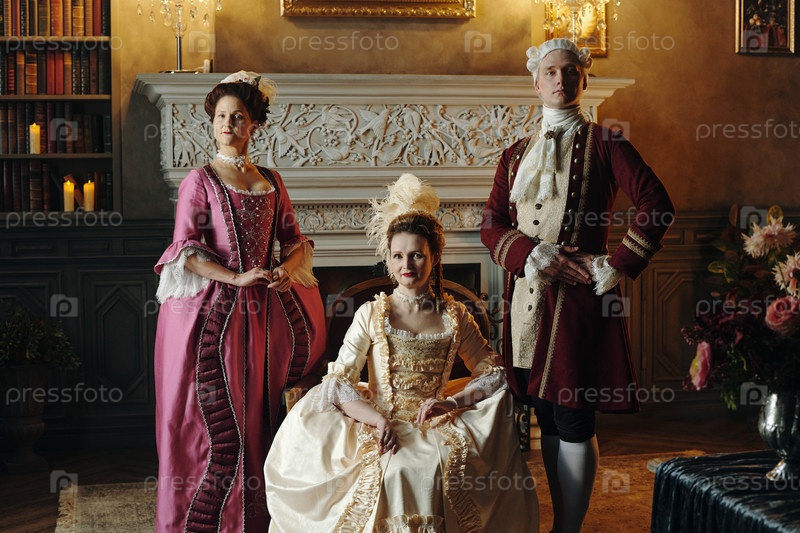 Молодая женщина сидит между взрослыми в костюмах барокко