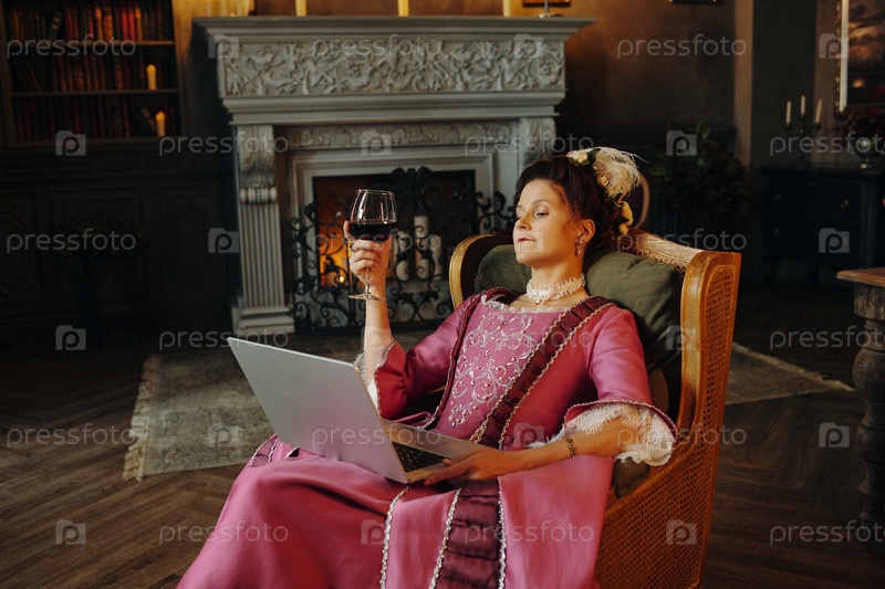 Женщина средних лет отдыхает с ноутбуком и вином в интерьере барокко