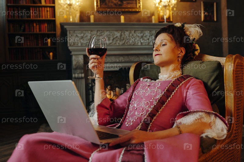 Женщина средних лет отдыхает с вином и ноутбуком в барокковой обстановке