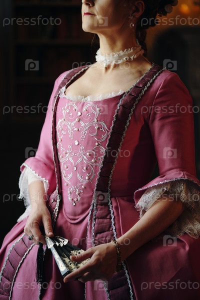 Женщина среднего возраста, держащая вентилятор, носящий платье в стиле барокко в помещении