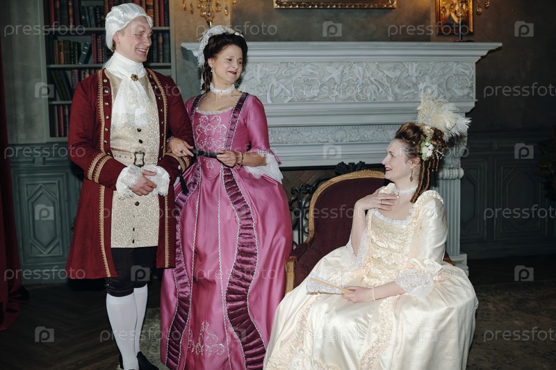 Молодые взрослые в костюмах барокко, занимающиеся элегантной беседой