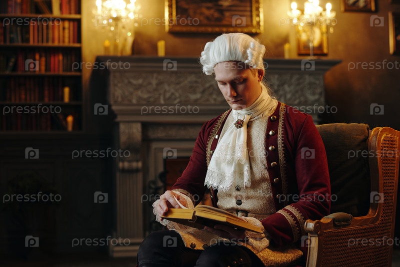 Молодой взрослый мужчина в костюме барокко читает книги внутри дома