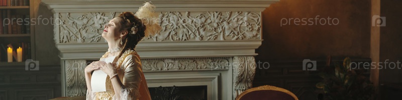 Женщина средних лет улыбается, стоя в барокковом интерьере