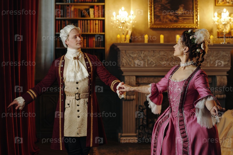 Молодой взрослый мужчина и женщина, исполняющие танцы эпохи барока в бальном зале