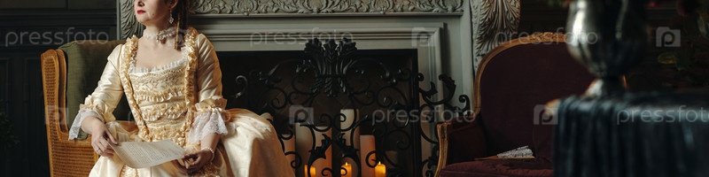 Молодая взрослая женщина читает письмо, сидя в интерьере барокко-ренесанса