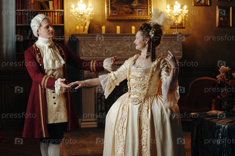 Молодой взрослый мужчина приглашает женщину танцевать в комнате барокко-ренесанса