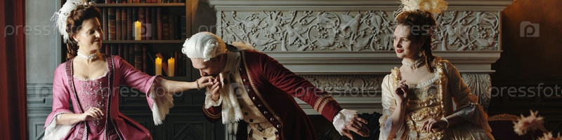 Молодой взрослый мужчина приветствует двух женщин поцелуем рукой в барокко