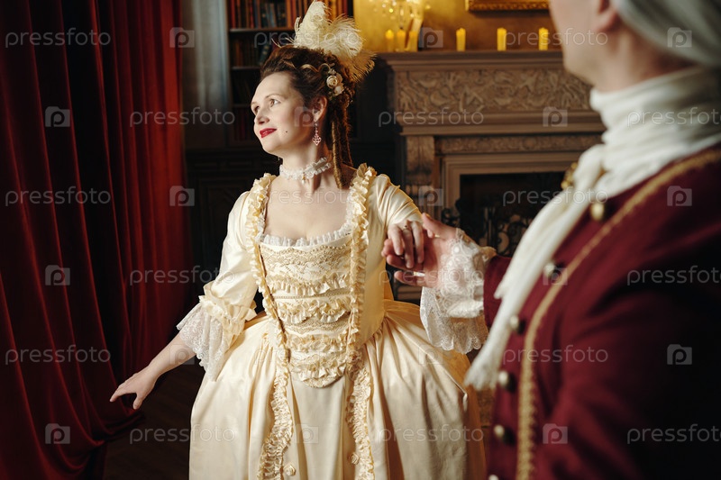 Молодая женщина танцует с мужчиной среднего возраста в барокковой обстановке