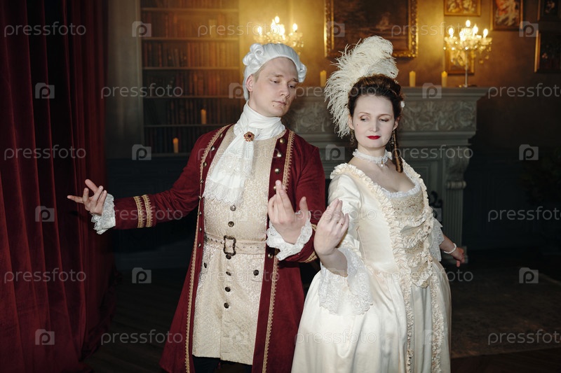 Молодой взрослый мужчина и женщина практикуют барокковый танец в комнате эпохи Возрождения