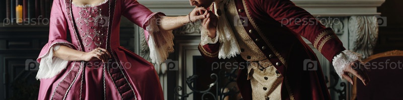 Молодой взрослый мужчина демонстрирует любезность, целуя руку женщины в помещении