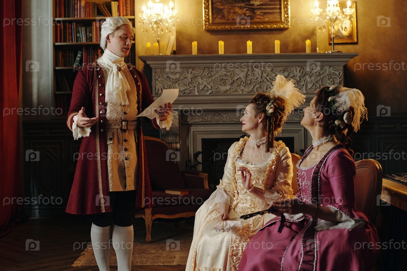 Молодой взрослый мужчина читает документ молодым взрослым женщинам, слушающим