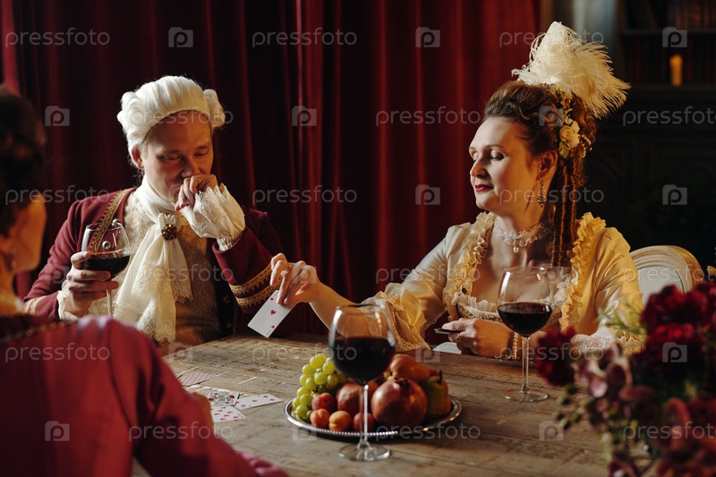 Мужчина и женщина средних лет играют в карты во время собрания барокко