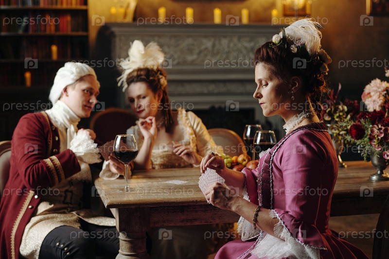 Молодые взрослые играют в карты в барокко-ренесансной обстановке в помещении