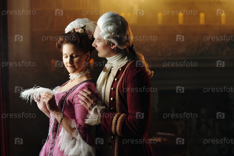Молодой взрослый мужчина обнимает молодую взрослую женщину в барокковой обстановке