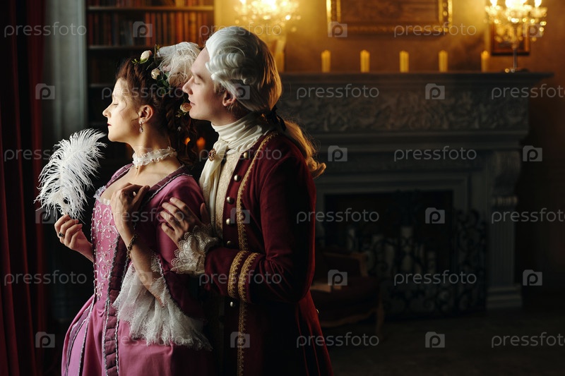 Молодая женщина и молодой человек воссоздают романтику эпохи барокко в помещении