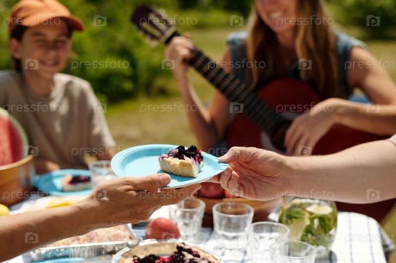 Женщина играет на гитаре, разделяя десерт во время пикника на открытом воздухе