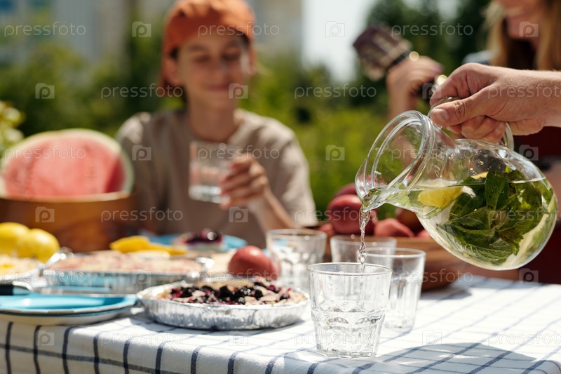 Девушка-подросток, сидящая на улице и пьющая воду во время летнего пикника