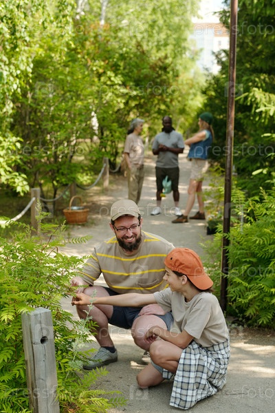 Мужчина среднего возраста и ребенок изучают растения в парке с разнообразной группой