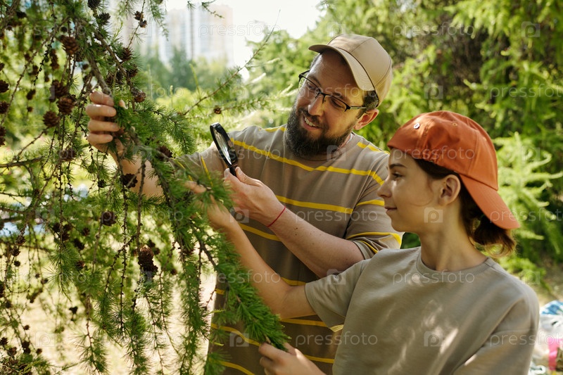 Мужчина средних лет и девочка-подросток осматривают сосновое дерево на открытом воздухе