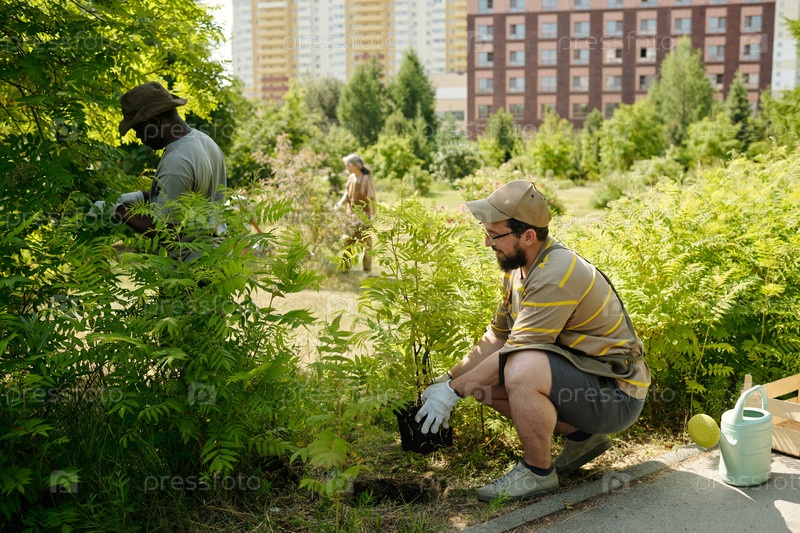 Молодой человек и чернокожий мужчина сажают кустарники в городском общественном саду