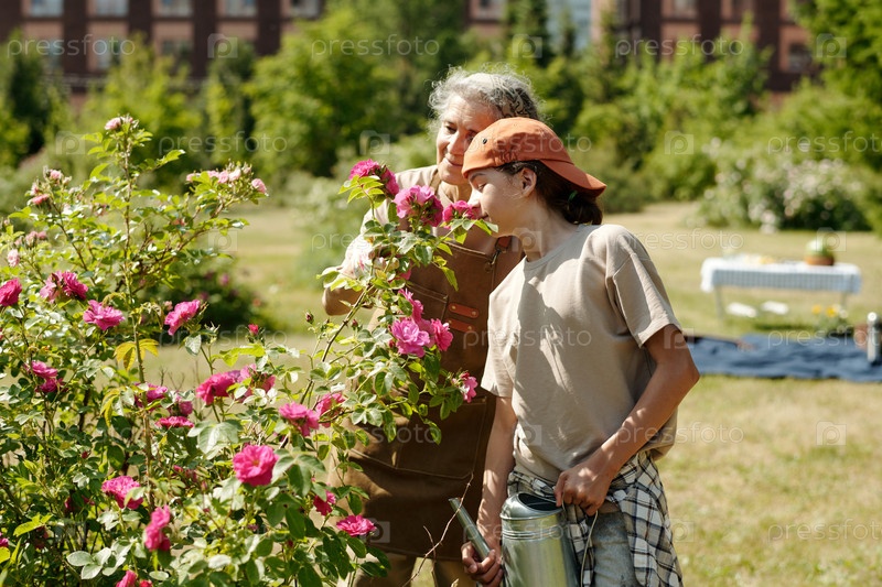 Старшая женщина и девочка-подросток вместе нюхают цветы в саду