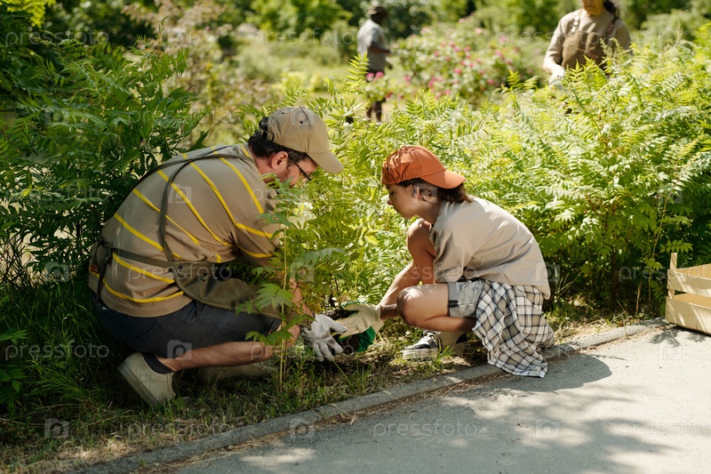 Мужчина и девочка-подросток сажают саженцы на открытом воздухе в парке Вместе