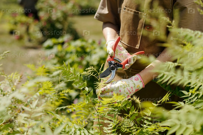 Молодая взрослая женщина обрезает зеленые кустарники садовыми ножницами на открытом воздухе