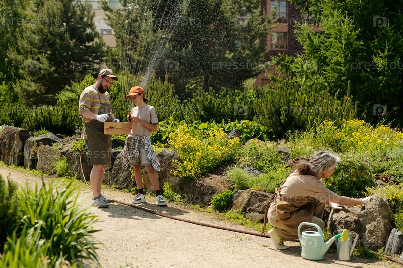Мужчина и подросток собирают овощи, в то время как старшая женщина садится